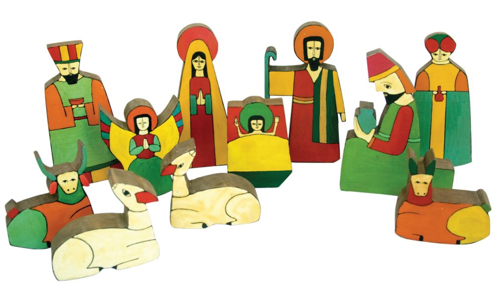 The Nativity scene most likely to look familiar to North Americans is the 11-character set from El Salvador (see the top image of this article). In the 1970s a group of artists led by Salvadoran Fernando Llort instigated a craft revival in the town of La Palma in the northern part of the country. Colorful paintings on wooden shapes used a simplified design aesthetic that was both easy to replicate and attractive to those influenced by 20th century Pop Art. Crisp execution, recognizable subject matter, and advertising that stressed artisans’ employment needs made the La Palma products popular in Christian circles.