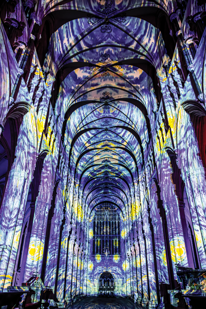 Walker’s exhibits are experimental in color, shape, and movement. Other multimedia installations offer a multisensory display, primarily focusing on light mapping, which draws attention to the intricate details and symbolism within the church that might otherwise go unnoticed.