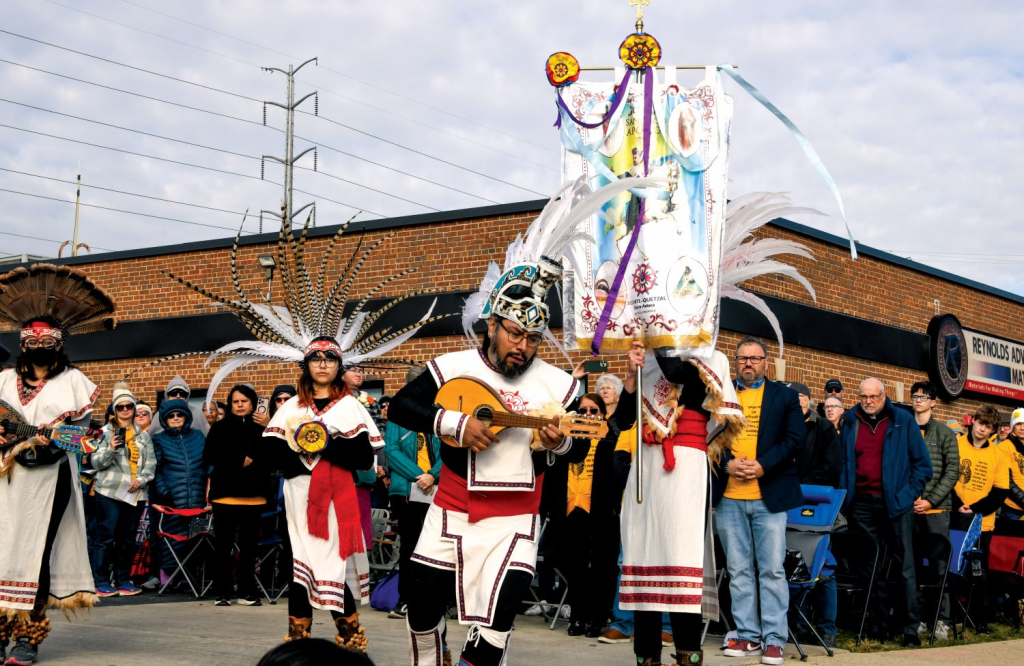 At the opening of the People’s Mass on November 1, Aztec dancers—concheros—wore regalia and played instruments and danced outside Broadview. The group, Xóchitl-Quetzal Aztec Dance: Mesa Santiago Apostol (Apostle St. James), dances out of a deep tradition of faith and social justice.